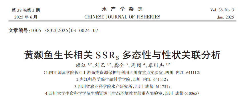 20256月,重点实验室教师颉江以第一作者在《水产学》杂志上发表一篇题为《黄颡鱼生长相关SSRs多态性与性状关联分析》的研究论文,重点实验室教师覃川杰教授和刘乙博士参与了该项研究。